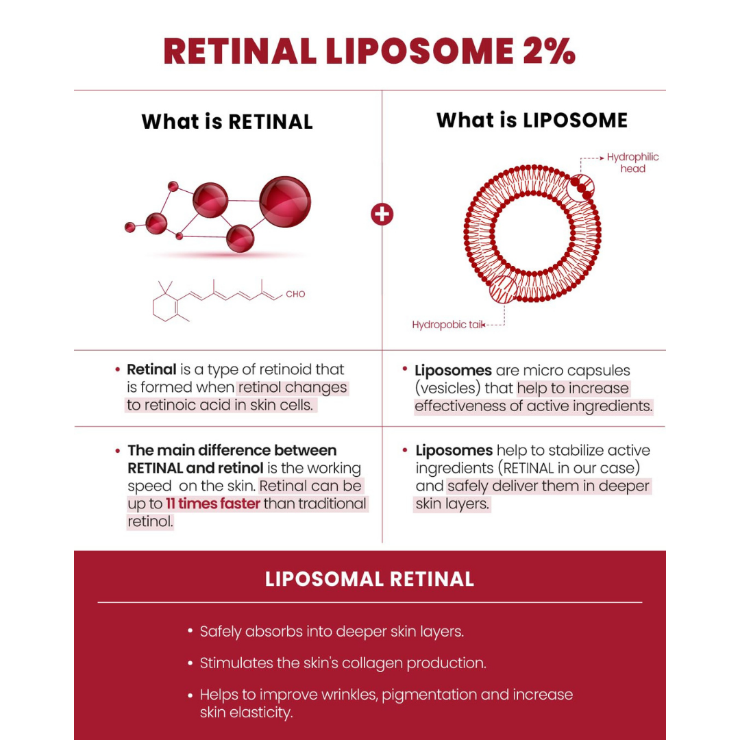 - RETINAL LIPOSOME 2% - helps to prevent signs of aging, such as fine lines, wrinkles, and uneven skin tone & texture.