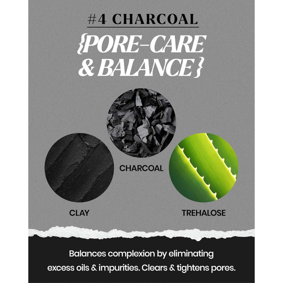 - Activated Charcoal - deeply cleanses and refines skin texture, smoothing uneven areas and clearing impurities. Designed for oily skin, it regulates excess oil while