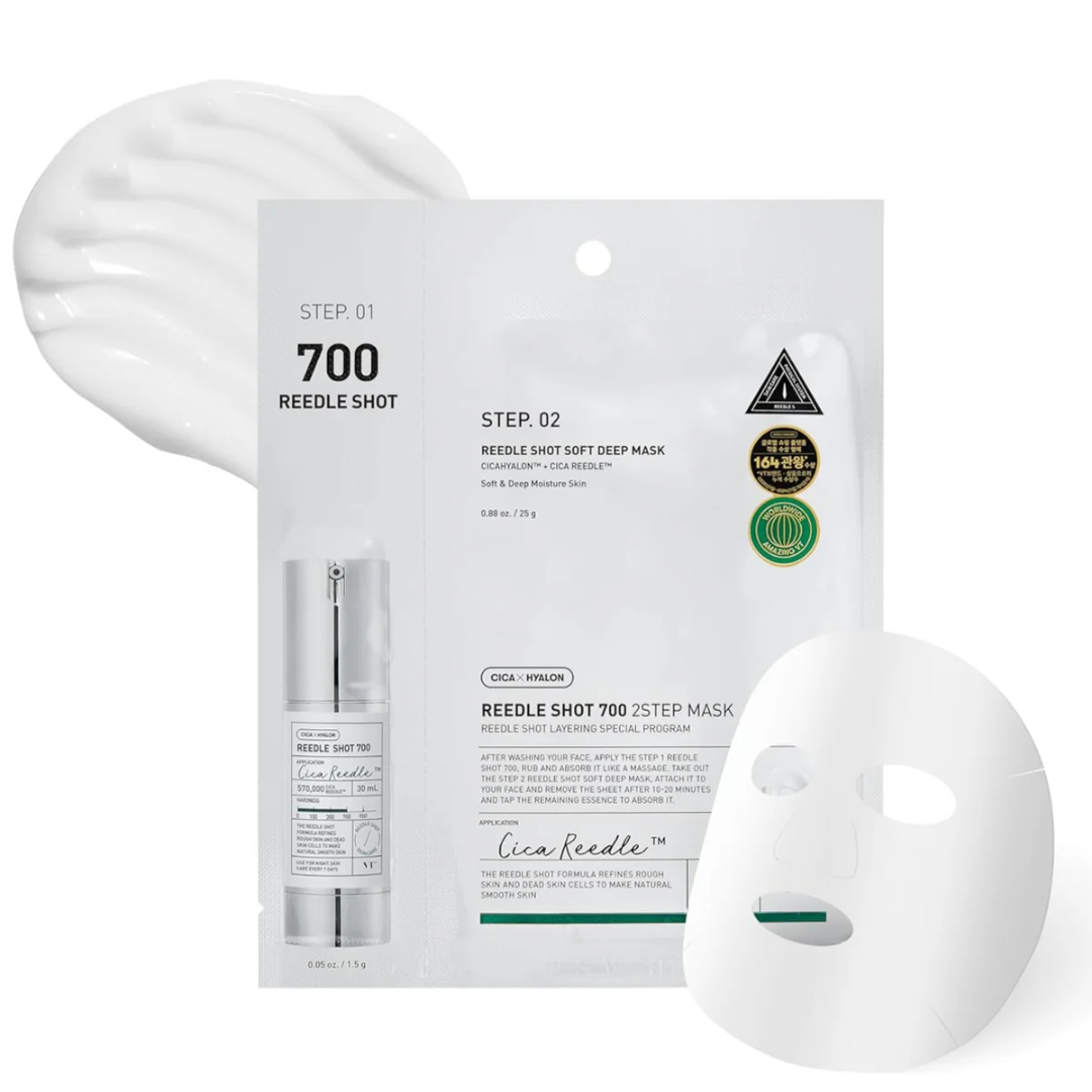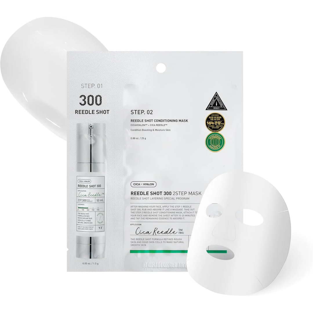 Improve skin texture and shrink enlarged pores with this two-step mask pack. The first step contains VT’s Reedle Shot 100, a skin treatment formulated with CICAHYALON™ for hydrating and soothing care. It’s powered by Cica Reedle™, an innovative skin care technology that imitates microneedling treatment to deliver low-molecular active ingredients deep into skin. The second step of mask includes the Reedle Shot Balance Mask that locks in moisture on skin and enhances the effectiveness of the Reedle Shot 100 ampoule.
